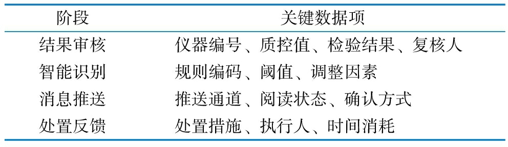 阶段关键数据项结果审核仪器编号、质控值、检验结果、复核人智能识别规则编码、阈值、调整因素消息推送推送通道、阅读状态、确认方式处置反馈处置措施、执行人、时间消耗