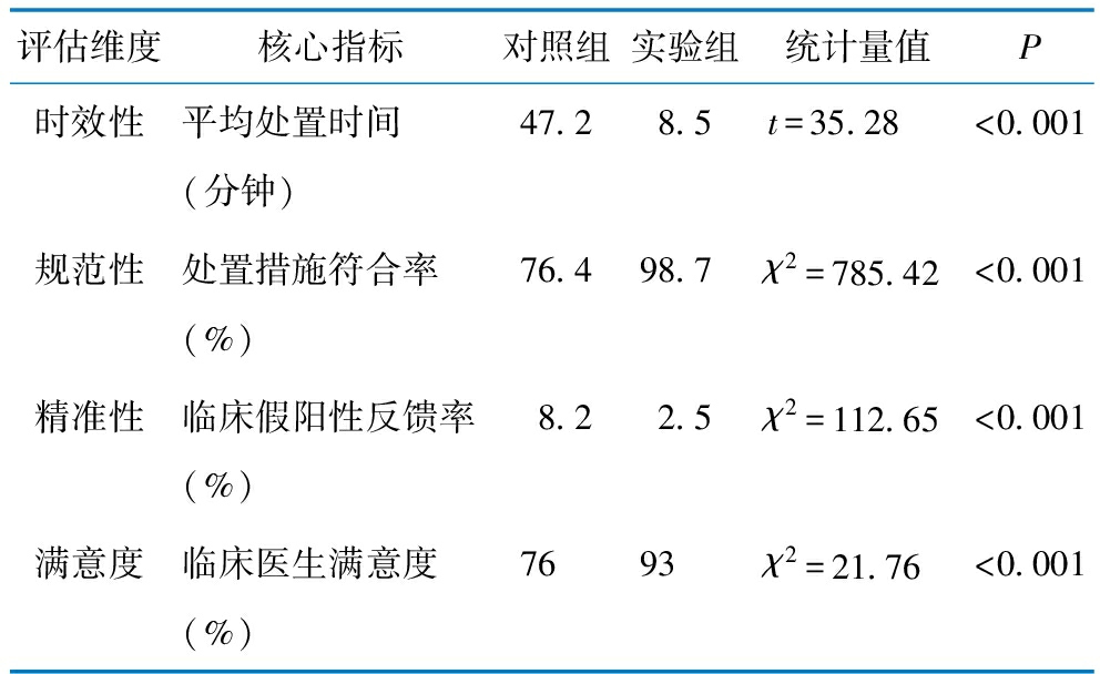评估维度核心指标对照组实验组统计量值P时效性平均处置时间(分钟)47.28.5t=35.28<0.001规范性处置措施符合率(%)76.498.7χ2=785.42<0.001精准性临床假阳性反馈率(%)8.22.5χ2=112.65<0.001满意度临床医生满意度(%)7693χ2=21.76<0.001