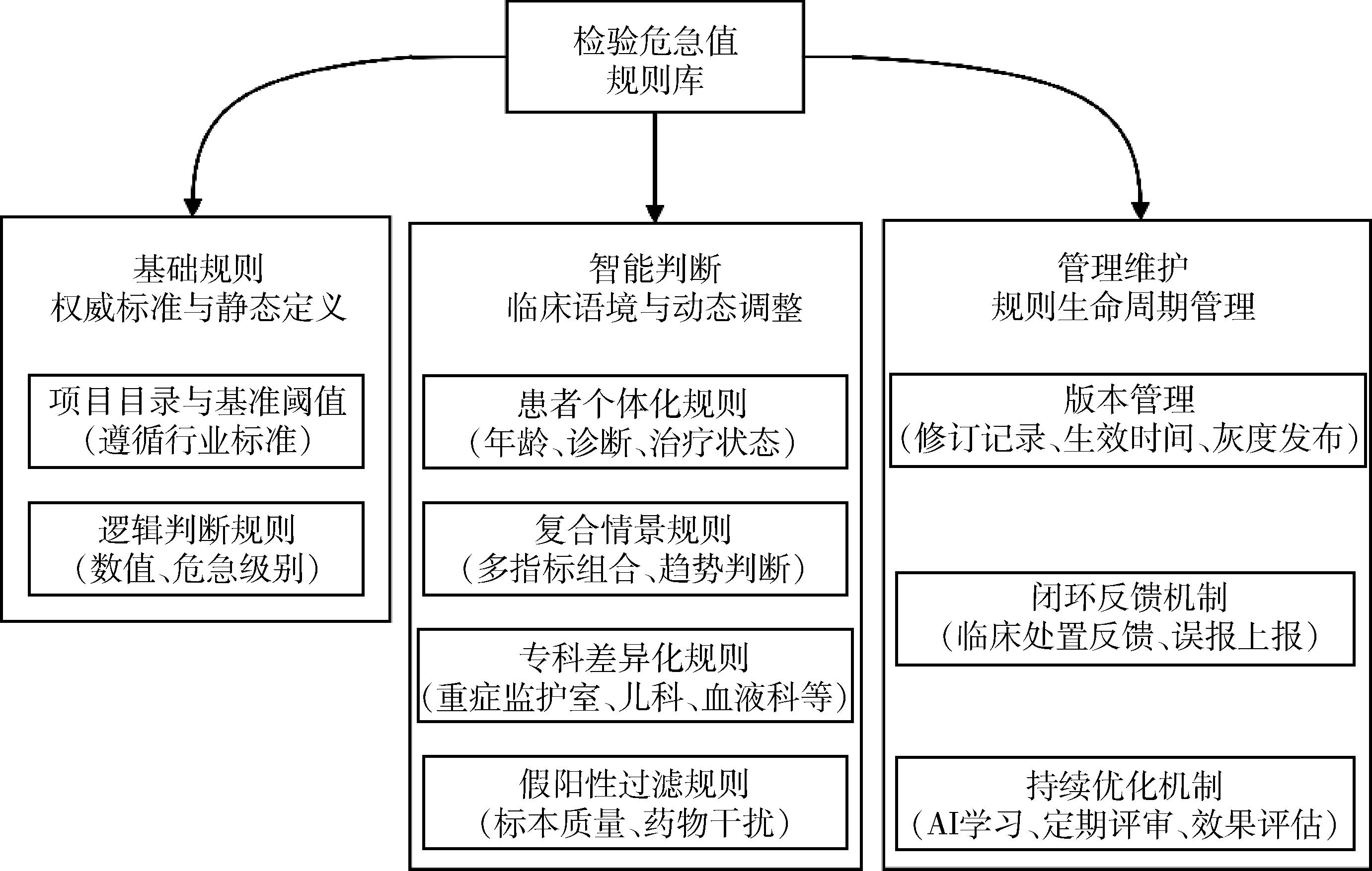 3.3.1 规则库建设 规则库是危急值全流程闭环管理的核心,其设计应遵循动态化、场景化、个性化原则,其内容构成,见图2。建设中重点突破3个维度。一是多层级阈值体系,以检验项目危急阈值为基础库,结合专科个性化规则及患者个体医疗数据,实现危急值规则差异化及动态校准。二是智能判定逻辑强化,建立复合规则模型,除单项指标越界外,增加多项目组合预警规则。三是闭环自优化机制,构建双通道反馈系统。同时,采用版本化管理:基于危急值处置数据分析,经相关管理部门及专家评审后迭代规则。