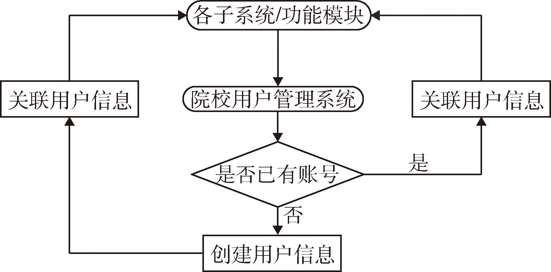 3.2.1 人员流动管理 建立人员流动管理流程,见图2,以解决人员流动造成的同一人员在不同系统中重复创建多个账号的问题。针对院校能自主创建人员账号的系统或功能模块,建立信息传输通道。针对各子系统,区别于传统直接创建账号的操作模式,要求子系统提交账号创建请求时,先经院校用户管理系统查询,如果账号已存在,直接进行账号关联;如果账号不存在,则新建账号并推送至相应子系统进行管理。优化后的人员流动管理模式可实现一个用户只有一个账号(以ID为系统唯一标识)的目标。无论是留校任教(如学生转为教职工)还是学生学位变动等情况,都不再需要停用或重新创建账号。同时,考虑各所院个性化工号编码需求,系统支持修改工号。