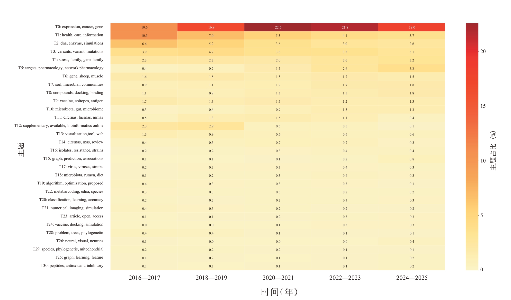 T0基因表达与癌症在所有时间窗口均呈现最深红色,研究热度从2016—2017年的10.6%持续增长至2024—2025年的18.0%,标志着生物医学计算已成为领域核心。与之对比,T1医疗信息系统虽保持稳定产出,但下降趋势明显。T3基因变异等计算生物学主题同样展现由橙向红的渐进升温特征,表明领域重心已从信息管理转向数据驱动的生命机制解析。二是技术融合加速深化。多个主题在2020年后骤然升温,如T5网络药理学,体现了系统生物学方法与人工智能的持续融合。T15图预测、T26神经网络等深度学习主题的研究热度从0.1%分别上升至0.8%、0.4%,表明新兴计算技术正快速渗透至传统研究领域。三是学科交叉纵深拓展。本研究识别出多个新兴跨学科主题,如T72骨再生与生物支架、T57空间转录组学、T86铁死亡与代谢等,虽然当前文献量较低,但其融合信息学与生物材料学、空间生物学、代谢生物学等领域,体现了医学信息学向多学科交叉纵深发展的态势。
