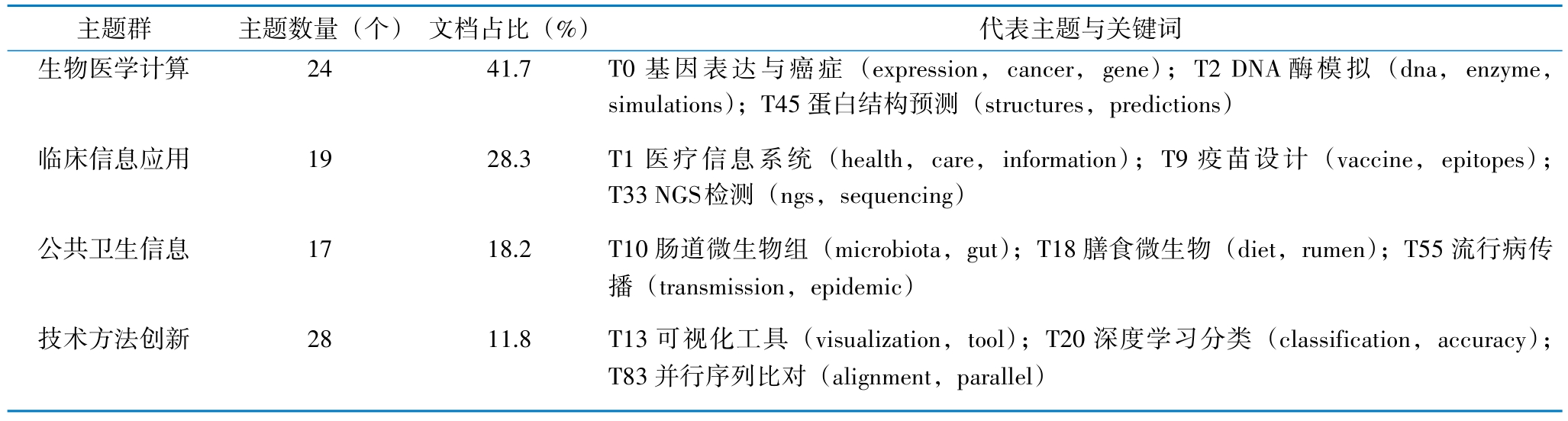医学信息学领域呈现多元化、高度交叉的分布格局,BERTopic识别出的88个核心主题,可归纳为4大核心主题群,见表2。生物医学计算是领域发展的主导方向,聚焦基因表达、癌症机制、蛋白结构预测等微观层面的计算模拟与机制挖掘,是医学信息学技术的典型应用场景。临床信息应用直接面向医疗实践,涵盖医疗信息系统、疫苗设计等主题,是连接基础研究和临床转化阶段的信息学应用。公共卫生信息关注肠道微生物组、流行病传播等传统健康管理和宏观公共卫生问题。技术方法创新持续为前沿研究提供可视化、深度学习等新型方法与工具,该主题群主题数量多、文档占比低,表明新兴技术仍处于探索阶段,文档分布分散。上述主题分布特征反映出医学信息学是一门以计算方法为核心、衔接基础研究与临床公共卫生应用的综合性学科。