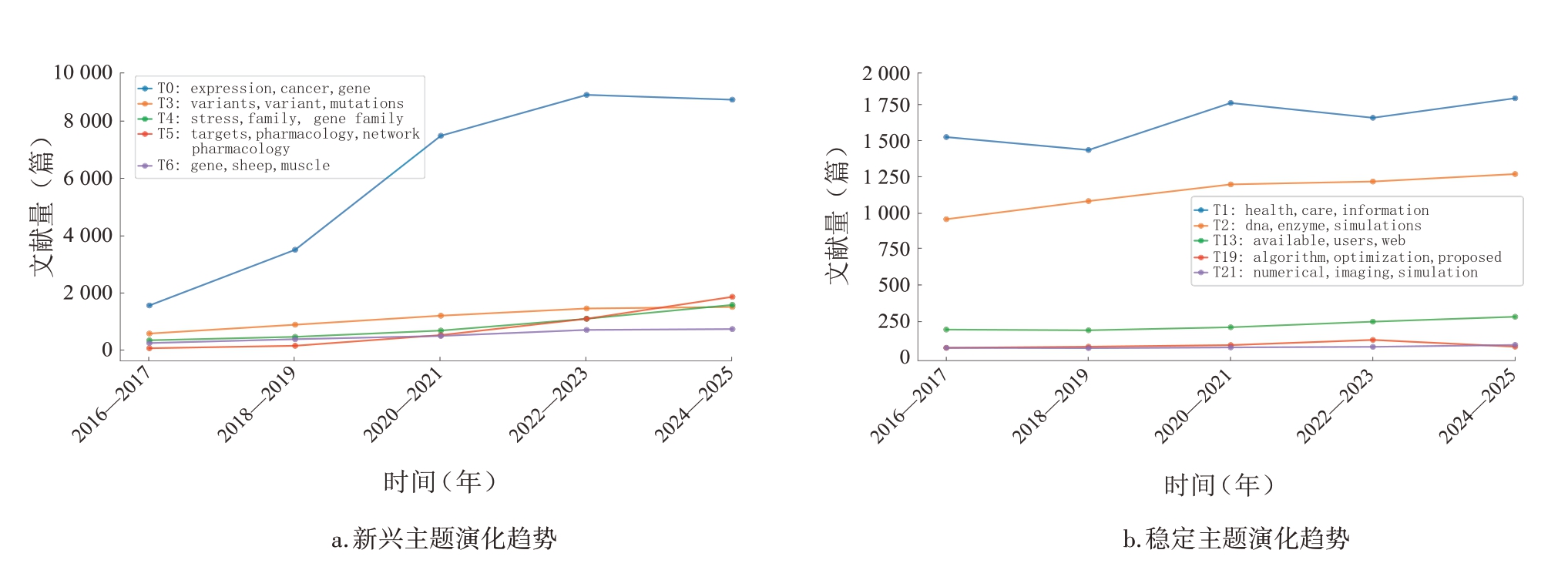 3.2.1 主题演化模式 以两年为时间窗口追踪主题演化,将88个主题归类为新兴、稳定、衰退3种模式。文档数量最多的5个新兴主题演化趋势,见图2a。新兴主题呈现显著增长趋势:T0基因表达与癌症增长最为迅速,文献量从2016—2017年的约1 600篇增至2022—2023年的9 000余篇,之后保持在9 000篇左右,显示该领域研究热度持续高涨;T3基因变异、T4基因家族功能分析、T5药理学网络虽增长相对平缓,但均保持稳定上升,文献量从数百篇增至1 500~1 800篇。文档数量最多的5个稳定主题演化趋势,见图2b。稳定主题呈现成熟研究领域的平稳演化特征:T1医疗信息系统文献量维持在1 400篇左右;T2 DNA酶分子动力学、T13可视化分析工具和T19算法优化缓慢增长,反映了基础性研究方向的持续性和稳定性。衰退主题共4个,代表影响力逐渐减弱或已被整合的方向,如T12补充信息与数据可用性,文献量自2016年逐渐下降。随着数据平台标准化的推进,此类方法性研究逐渐减少。