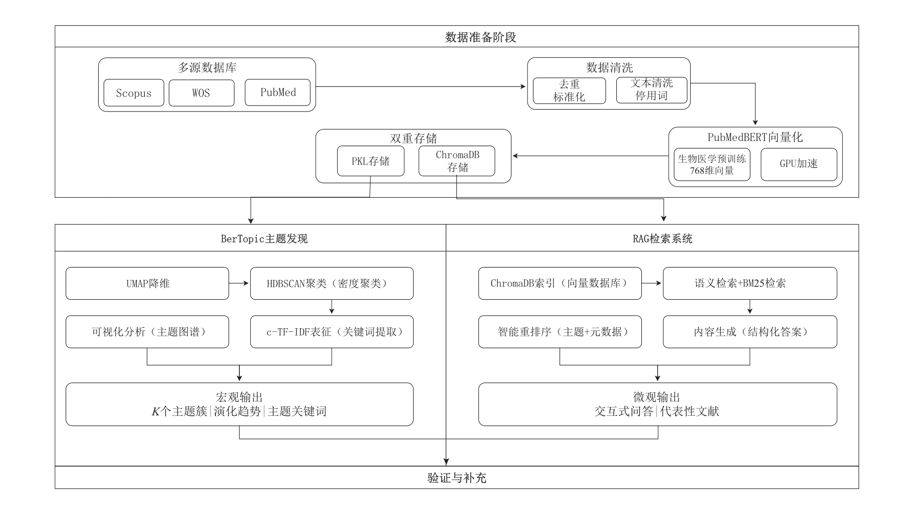 构建BERTopic-RAG框架,基于多源数据库文献,实现宏观识别、中观演化、微观验证,具体研究框架,见图1。BERTopic模块从海量文献中识别主题并构建宏观知识图谱,结合动态映射从中观层面追踪研究主题演化;RAG模块通过精准语义检索,验证和深化主题分析结果,实现微观层面的知识发现。两模块均利用Python3.10实现。