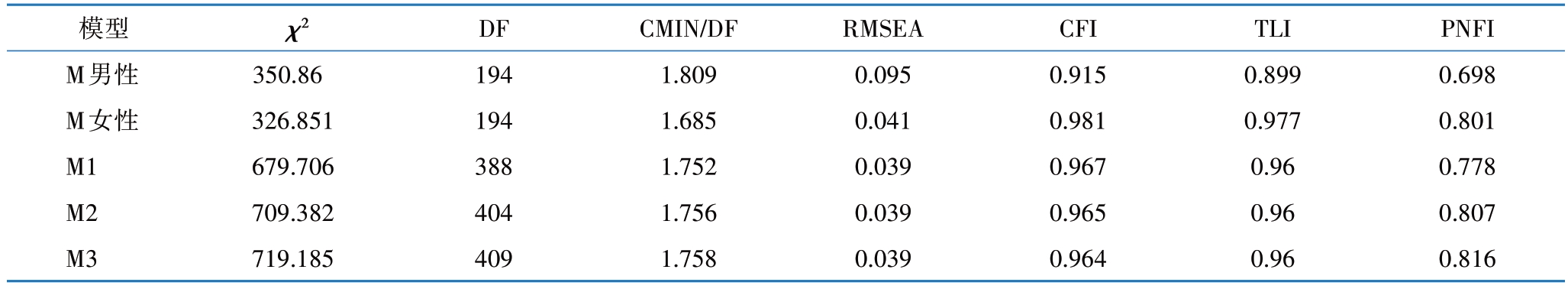 表7 多群组(性别)模型拟合结果