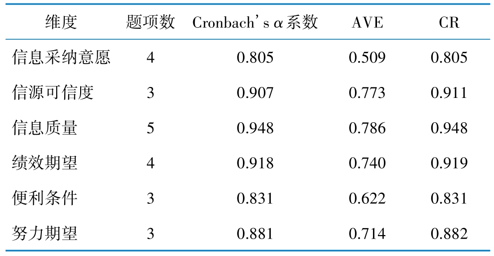 表3 内部一致性和收敛效度分析结果