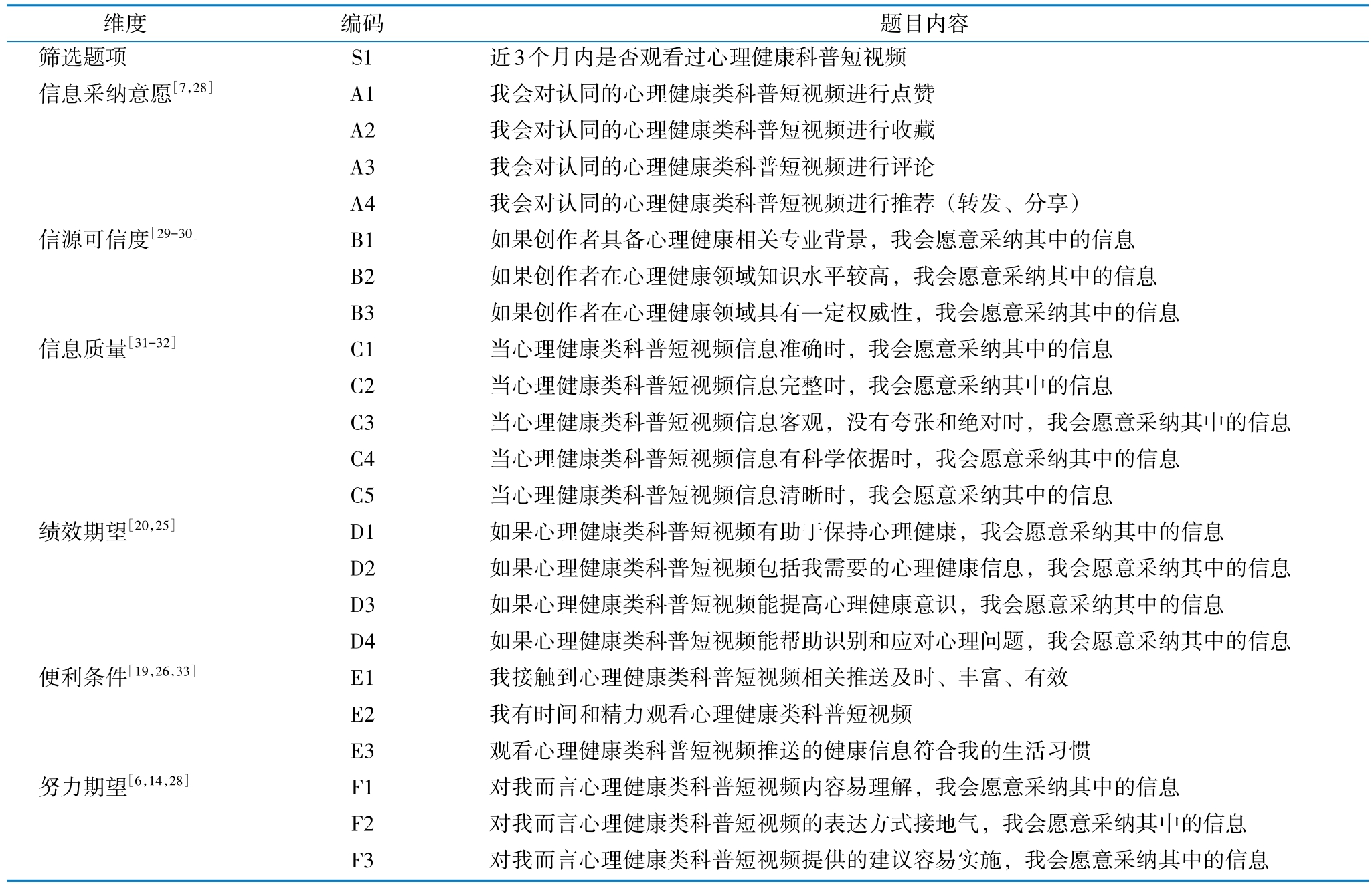 健康信息采纳是用户接受并使用健康信息的核心环节,但学术界尚未形成健康信息采纳行为的经典模型,相关研究均基于若干经典理论和模型,抽取部分或全部要素[12],主要包括3种演化路径:一是以技术接受与使用统一理论(unified theory of acceptance and use of technology,UTAUT)为代表的信息系统采纳理论模型衍化路径;二是以信息采纳模型(information adoption model,IAM)为代表的信息采纳基础模型衍化路径;三是社会学、心理学和信息系统领域其他经典模型衍化路径[13-14]。国内实证研究中,Li P等[15]证实绩效期望与便利条件对健康信息采纳意愿影响显著,陈思思等[4]发现信息说服力、信息内容质量等是主要影响因素。但现有研究[4,12,16-20]多集中于泛健康领域,未形成适配心理健康科普短视频信息采纳的理论框架,对采纳意愿影响因素的解释力不足。