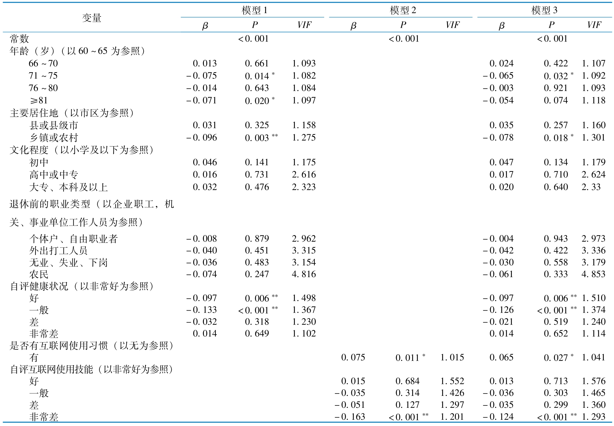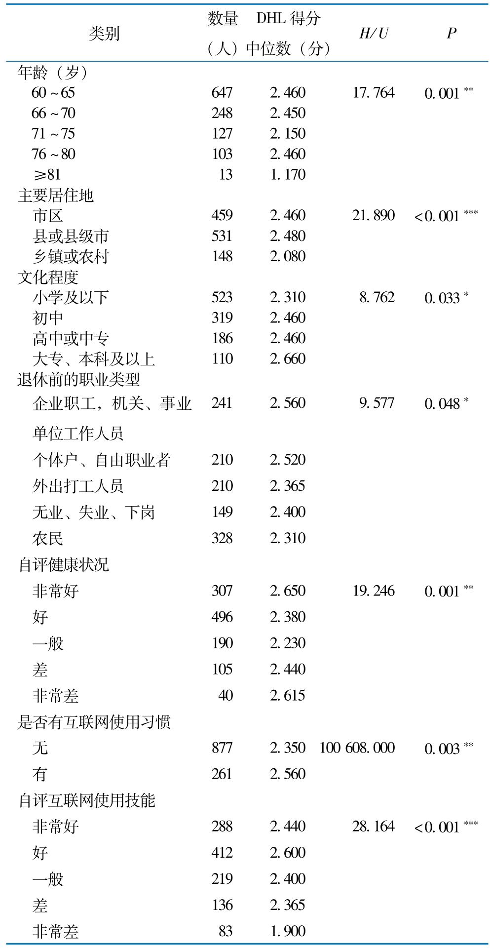 多元线性回归分析结果,见表3。模型1结果显示,年龄较大(71岁及以上)、居住在农村地区及自评健康状况一般的老年人DHL得分显著较低。模型2结果显示,有互联网使用习惯的老年人DHL得分较高,且评分随着自评互联网使用技能提高而提高。同时,自评互联网使用技能为“非常差”的老年人DHL得分显著更低。模型3结果显示,控制潜在混杂因素后,年龄、自评健康状况、互联网使用习惯和自评互联网使用技能与DHL得分之间存在显著相关性。