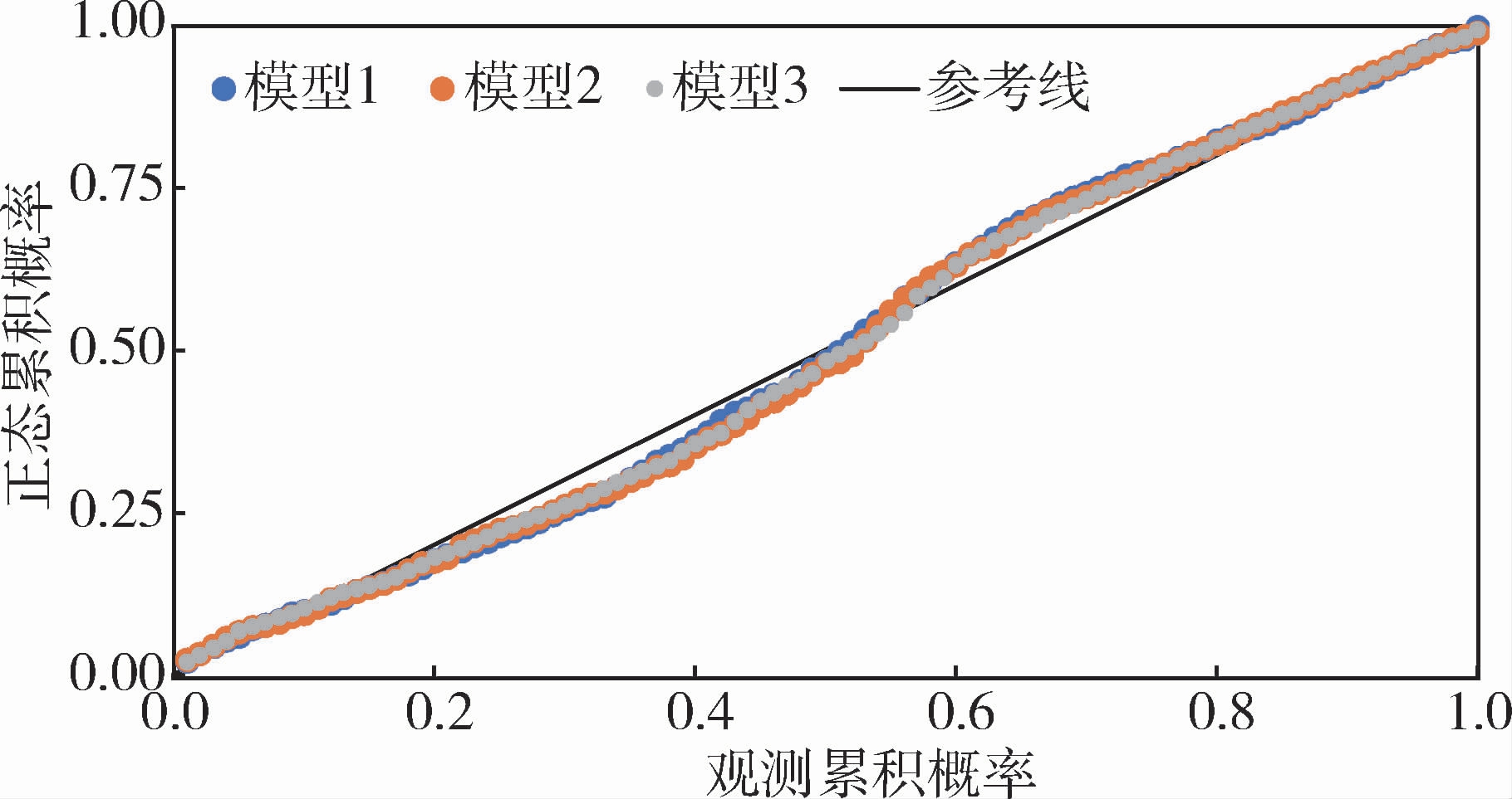 对3个回归模型的回归残差进行正态性检验。通过绘制P-P图进行可视化分析,见图1。残差点基本落在45°参考线附近,未发现明显偏离。