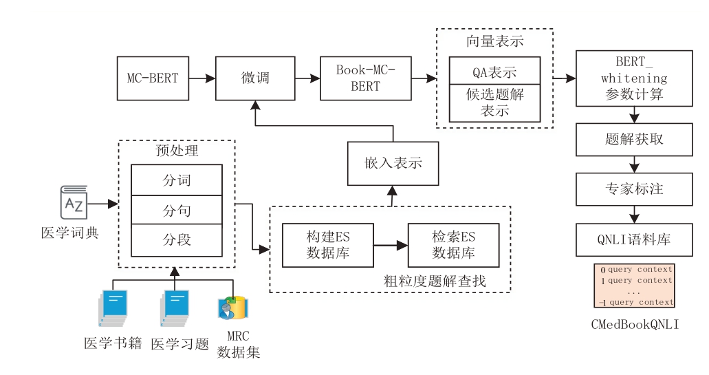 针对医学解析生成对概念完整性和逻辑严谨性的特殊要求,MC-BERT的全实体遮蔽策略将医学概念作为完整单元处理,能够确保模型学习概念层面的逻辑关系;同时通过知识图谱增强显式融入结构化医学知识,使模型学习教材知识体系的内在逻辑。提出基于MC-BERT模型的医学参考答案解析推荐框架,结合预训练语言模型与自然语言推理任务,实现医学习题解析的半自动化生成,见图1。MC-BERT模型使用多源中文生物医学语料进行自监督预训练,学习领域特异性词嵌入。微调阶段:以社区问答和医学教科书等语料对模型进行领域适配微调,优化语义表示。QNLI任务构建阶段:将医学习题的问题-答案对与从教科书抽取的候选解析组合为处理单元,通过模型计算语义匹配得分,筛选高评分解析形成最终答案。经人工标注,将上述输出构建为结构化数据集CMedBookQNLI。