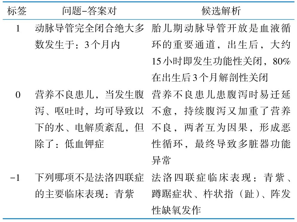 使用最优模型,经过人工标注,最终形成可支持QNLI任务的语料库CMedBookQNLI,包含9 246条记录。标注范例,见表3。标签分为3类,1代表蕴含,基于候选解析可推理出答案;-1代表矛盾,基于候选解析可以排除答案;0代表不相关,候选解析与答案无关。每一个标注范例均可对应到原始问题标号及解析对应的具体章节,方便信息回溯。