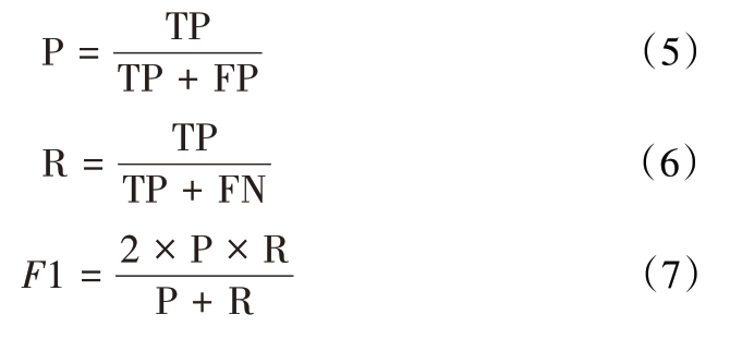 以解析推荐精确率(precision,P)、召回率(recall,R)和F1值为主要评估指标,判断模型推荐答案与专家标注标准答案的一致性。其中,TP表示真正例,FP表示假正例,FN表示假负例。