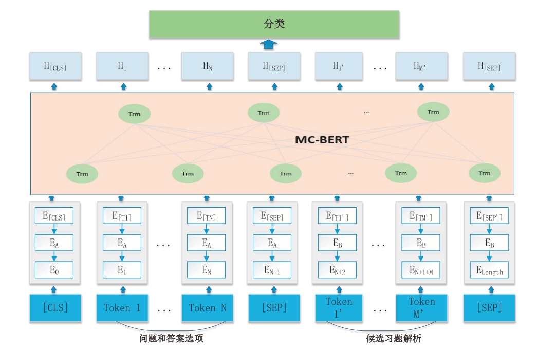 给定一对输入句子{X,Y},X={x1,x2,…,xN},Y={y1,y2,…,yM},其中X代表由问题和候选答案构建的查询,Y代表从教科书中检索到的候选解析上下文,xi 是查询的第i个词/标记,yi 是上下文的第i个词/标记,N和 M分别代表查询和上下文的长度。分类的目标是判断X和Y是否彼此相关。将该任务视为机器阅读理解任务,从而将标注风格的数据集转换为一组(查询,上下文,答案)三元组。其中,查询是给定的输入句子X,上下文是根据句子X抽取的候选解析句子,而答案是查询与上下文之间的目标关系。