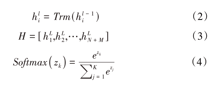 采用基于BERT的模型架构,并以专门针对生物医学领域预训练的MC-BERT参数进行初始化。使用MC-BERT在机器阅读理解(machine reading comprehension,MRC)框架中实现分类任务,见图2。首先,连接查询X 与上下文Y,形成组合序列,其中[CLS]和[SEP]是用于标记开始和分隔的特殊标记。其次,将组合序列输入MC-BERT,主要通过公式(1)—(3)定义。其中L表示MC-BERT的总层数,l 是当前层的编号,Trm表示Transformer块,包括多头注意力层、全连接层和归一化层。此外,H是MC-BERT的输出,N+M是查询和上下文的总长度。最后,执行一个二元分类器进行模型预测。K 表示分类类别数,zk 表示第k 个类的逻辑值(从H中获得的相似度值)。