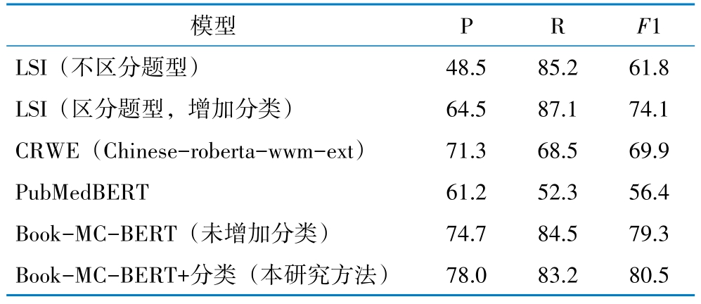 以基于LSI的参考信息推荐模型(LSI模型)作为比较模型,验证Book-MC-BERT模型的性能。在不区分题型(案例类与事实类)的情况下,精确率为48.5%。分析参考信息推荐错误的案例发现,问题的主题分类(尤其是第3级分类)与定位到的章节目录信息有很强的相关性。去除案例类实体,仅研究事实类问题,且加入主题分类相似度计算时,改进的LSI模型精确率为64.5%。CRWE模型和Book-MC-BERT模型精确率分别达到71.3% 和74.7%,说明了基于深度学习的问答模型的有效性。PubMedBERT模型的性能仍显著低于CRWE模型。尽管进行了中文词表扩展,但其预训练目标(随机掩码语言建模)无法适应医学概念完整性要求,且英文语料训练导致的语序差异进一步影响中文医学文本理解。增加分类信息后,Book-MC-BERT模型精确率升高至78.0%,比基础模型LSI模型提高了20.9%。通过对比结果,本研究方法取得了最优结果,见表2。