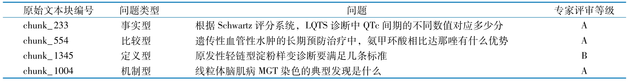 4.1.2 评测数据集 基于207种罕见病的指南原文,由两名具有医学背景的研究人员独立进行评测数据集构建。为模拟真实的查询需求,问题被设计为多种类型,包括事实型、比较型、定义型和机制型。数据集中每个问答对均明确标注了其对应的原始文本块。为确保标注的客观性与一致性,引入质量控制流程,对标注数据进行跨标注者一致性检验(interannotator agreement,IAA)。针对核心标注任务“问答对-原始文本块”匹配,其Cohen’s Kappa值为0.87,表明评测数据集一致性检验符合要求。由专家对评测数据集所有问答对进行交叉审核和终审。审核过程中,专家根据问题的质量、答案的准确性与原文的匹配度,将其评定为不同的质量等级。对于存在分歧的标注,通过集体讨论达成共识,以确保数据集的准确性、问题表述的清晰度以及答案的唯一性。最终构成的评测数据集示例数据,见表2。
