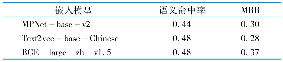 4.3.1 嵌入模型对比 嵌入模型对比结果,见表3。BGE-large-zh-v1.5与Text2vec-base-Chinese语义命中率相同,均优于以英文语料为主的MPNetbase-v2。BGE-large-zh-v1.5的MRR优于其他模型,表明其能更可靠地将相关知识排在更靠前的位置,这对RAG至关重要。因此选择BGE-large-zh-v1.5作为后续所有实验的唯一嵌入模型。