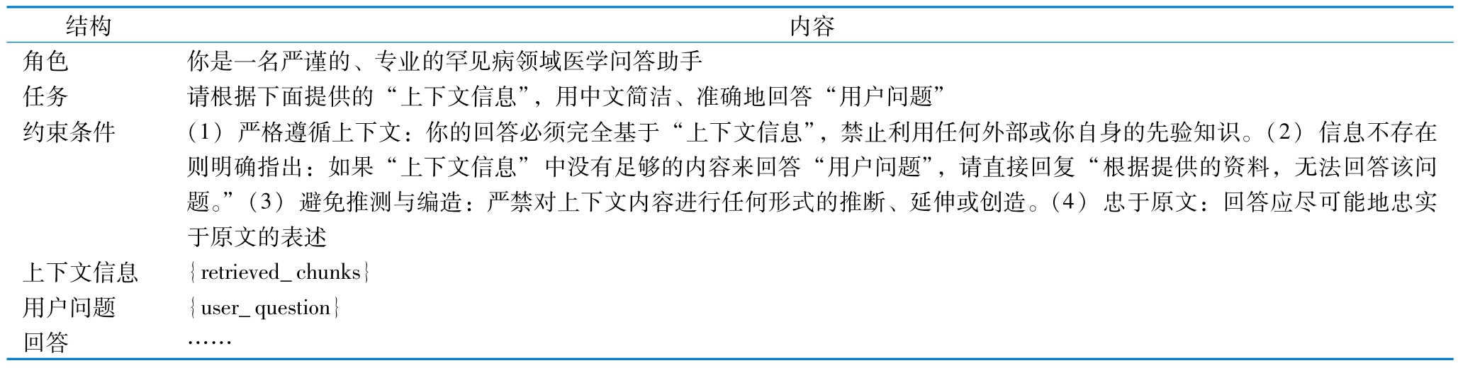 3.3.4 提示构建与答案生成 经过混合检索和重排序优化后,获得K个最相关的知识片段。将排序后的知识片段拼接成连贯的文本,与用户查询共同构建提示。为确保LLM能够准确、可靠地基于检索到的上下文生成答案,并最大限度地抑制“幻觉”,设计专门的提示模板,通过明确的角色设定、严格的任务指令和清晰的约束条件,引导模型的行为,见表1。为验证Med-HyRAG的通用性,将构建的提示分别输入3个不同架构的基座LLM,分别是DeepSeek-V3.1[35]、Gemini-2.5-pro[36]和GLM-4.5[37],利用其上下文理解和零样本生成能力,对检索到的医学知识进行综合、提炼与组织,从而生成逻辑清晰、语言流畅且符合医学规范的回答。