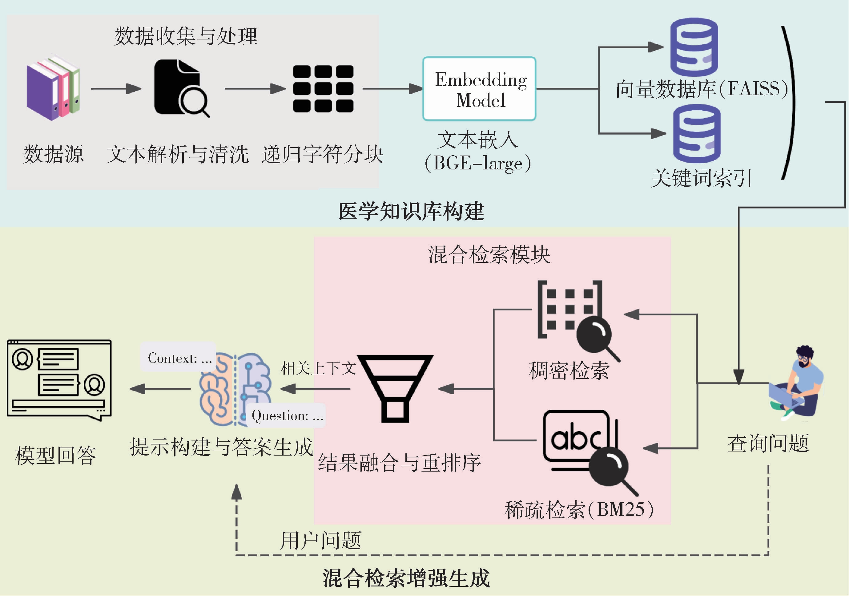 针对上述挑战,本研究提出医学知识驱动的混合检索增强生成方法(hybrid retrieval-augmented generationmethod driven bymedical knowledge,Med-HyRAG),并以罕见病领域为例,利用该方法融合两种检索策略的优势,既保证对专业术语的精确匹配,又兼顾对自然语言查询的语义理解;通过倒数排序融合(reciprocal rank fusion,RRF)算法对检索结果进行融合优化,为下游LLM生成提供高质量、高相关的上下文知识。