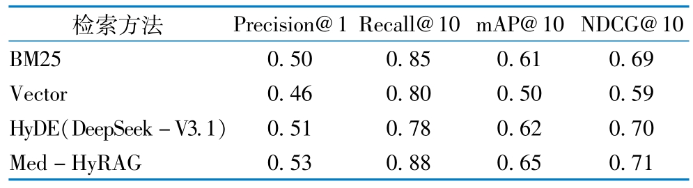 4.3.2 检索策略性能对比 为进一步验证Med-HyRAG的有效性,引入假设性文档嵌入(hypothetical document embeddings,HyDE)[39]作为对比基线。HyDE旨在解决查询与文档表述不匹配的问题。其先利用一个指令遵循LLM(本研究采用DeepSeek-V3.1[35]),根据用户原始查询生成一篇风格与知识库文档风格相似的“假设性文档”;再对该富含上下文的假设性文档进行向量化,并以此生成的向量执行相似性检索,而非对原始短查询进行操作。对比稀疏检索(BM25)、稠密检索(Vector)、假设性文档嵌入检索(HyDE(DeepSeek-V3.1))以及本研究提出的混合检索(Med-HyRAG)4种方法性能。采用Precision@1衡量检索准确性,采用Recall@10、mAP@10和NDCG@10综合评估检索结果的全面性和整体排序质量。各项指标的性能对比,见表4。Med-HyRAG在所有指标上均显著领先。作为基线,BM25和Vector展现了各自的检索倾向,但综合性能有限。先进的HyDE方法虽然通过LLM生成假设性文档小幅提升了排序质量,但其召回率甚至略有下降,这可能是由于LLM生成的文档在专业领域存在细节偏差。相比之下,Med-HyRAG通过融合稀疏检索的精确性和稠密检索的语义理解能力,取得了最高的Precision@1和Recall@10值,证明其结果兼具准确性与全面性。因此,混合策略能有效弥补单一范式的不足,应对医学知识服务的双重挑战,为答案生成提供更高质量的上下文。