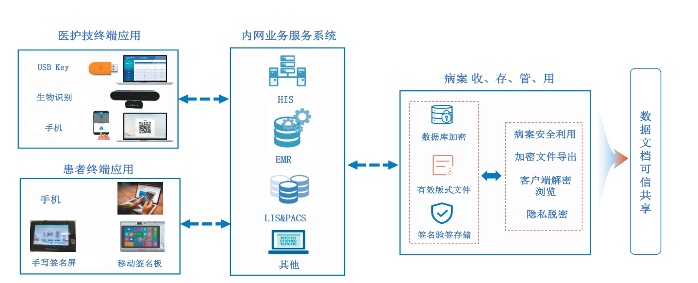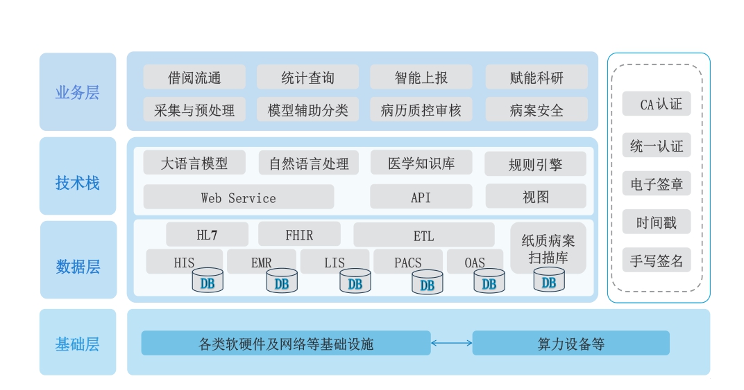 为应对上述问题,亟待构建安全可靠、一体化与智能化的病案管理平台。具体需求包括:通过模块整合与流程再造,实现病案管理各环节的闭环与无缝衔接,减少对人工的依赖,提升工作效率;归档环节实现自动化,确保严格符合《病案质量管理与控制指标》的时效与完整性要求;引入基于人工智能的实时质控与在线审批流程,及时识别文书问题并确保所有修改的可追溯性,保障病历内容的真实与准确;依据《电子签名法》等法规要求,构建基于数字证书的可靠电子签名体系,保障电子病历的法律效力,并全面推进无纸化,在降低运营成本的同时,确保病案信息的保密性、完整性与防篡改性。此外,应通过生成标准化、结构化的数据,支持多维度检索与安全可控的脱敏共享,打破数据壁垒,充分释放病案数据在医院管理、绩效评价及科研创新等方面的应用潜力。