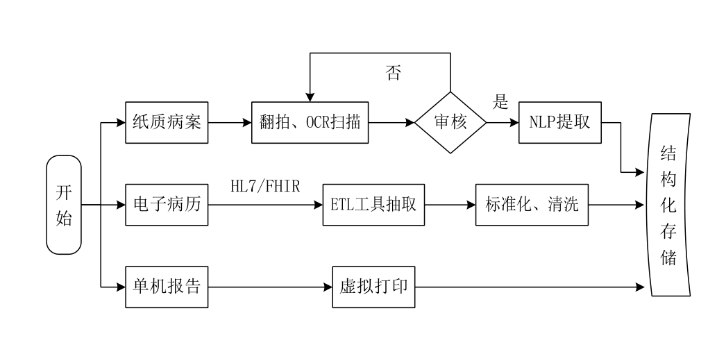 数据采集和预处理模块采用并行数据采集策略,实现对纸质病案、电子病历及单机报告的统一化、结构化处理,见图4。针对纸质病案,采用数字化翻拍和光学字符识别(optical character recognition,OCR)扫描技术进行文本识别,进而利用NLP技术提取病历文本中的关键信息,进行结构化存储[8-9]。针对电子病历,基于HL7/FHIR统一标准协议,利用ETL工具从HIS、EMR、LIS、PACS等异构源系统抽取数据,随后对原始数据进行标准化处理与清洗[10],消除冗余与错误,确保其符合目标存储模型的要求。针对单机报告,通过虚拟打印方式采集[11]。