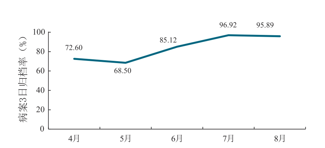 智慧病案管理系统自2025年5月上线运行以来,围绕病案无纸化建设,将“病案脱纸率”作为核心考量指标,同时结合质控覆盖率、3日归档率以及人力和耗材支出等运营数据,对系统应用前后的变化进行持续跟踪和描述性分析。相关数据主要来源于病案管理系统、信息系统运行日志及医院财务统计。一是业务流程优化,归档率提升。病案归档流程涉及的记录打印、整理分类、签名确认、归档校对等环节由系统提供完整性校验和预警提醒,病案3日归档率由72.6%提升至96.9%,见图5,调阅病案的平均等待时间同步缩短。二是质控模式革新与效率提升。质控模式由先前的事后抽查、人工被动审核,转变为系统规则驱动的主动、全覆盖智能质控,病历自动核查覆盖率由约50%提升至100%,医务人员及病案室工作人员对质控的及时性和便利性主观评价均优于系统上线前。三是运营成本逐步下降。随着业务流程优化和打印量下降,病案相关专职人力投入及纸张、硒鼓等耗材支出呈下降趋势,按年度测算每年可节省费用约50万元(含打印机硒鼓、纸张、病案包装袋、密集柜、人工成本等),一定程度上缓解了库房扩建和设备更新的压力。四是病案脱纸率显著提高。多数病案实现以电子文档为主的存储和调用,明显减轻了库房空间占用,提升了病案在医保审核、科研利用等场景的可及性和响应速度。