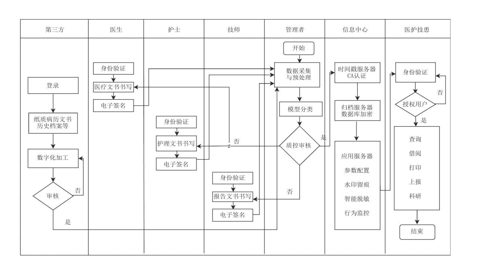 系统整合来自纸质病历文书、历史数据档案以及医院信息系统(hospital information system,HIS)、电子病历系统(electronic medical record,EMR)、检验信息系统(laboratory information system,LIS)、影像存储与传输系统(picture archiving and communication system,PACS)等核心业务系统数据,经数据采集和预处理、模型辅助分类和质控审核后,统一存储至医院数字化病案归档服务器。经安全防护模块处理保障数据安全,支撑各类应用服务。其业务流程,见图3。